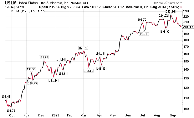 Another example of a successful dividend stock transaction in Five Star Trader involved United States Lime & Minerals, Inc. (NASDAQ: USLM), of Dallas, Texas. Its business has lime and limestone operations and natural gas interests. USLM turned a profit of nearly 4.5% in only 44 days as a pick in Five Star Trader.