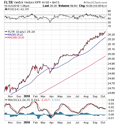 The VanEck Vectors Investment Grade Floating Rate ETF (FLTR) tracks an index of U.S. dollar-denominated, investment-grade floating-rate notes issued by corporations.