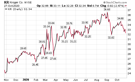 Kroger offers a dividend yield of 2.23% and it trades a 12.21 price-to-earnings (P/E) ratio. Its stock also has fallen in price recently, so investors may want to consider buying shares in Kroger if the upcoming Nov. 3 presidential election produces a clear winner.