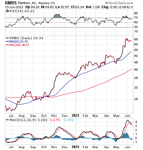RMBS has earnings per share (EPS) growth is in the top 3% of all companies, while relative price strength is in the top 2%, Woods wrote. The stock also is in a top-performing sector: semiconductors.