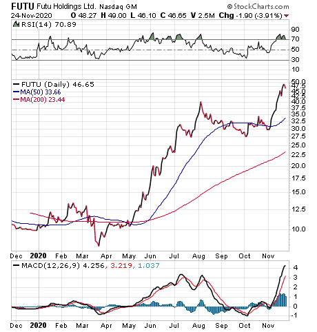 Woods, who heads the Successful Investing and Intelligence Report investment newsletters, as well as the Bullseye Stock Trader advisory service, elaborated that Futu provides online brokerage services and margin financing services through software and websites. Futu also offers investing services through its digital brokerage platform under the name of Futu NiuNiu.