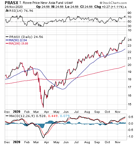 “I continue to recommend T. Rowe Price New Asia (PRASX) for investing in Asian emerging markets generally and China in particular,” said Bob Carlson, chairman of the Board of Trustees of Virginia’s Fairfax County Employees’ Retirement System with more than $4 billion in assets and head of the Retirement Watch investment newsletter. “The fund concentrates in a relatively few stocks of companies with strong growth rates but that are selling at reasonable prices.”