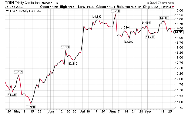 Trinity Capital Inc. (NASDAQ: TRIN), a Phoenix, Arizona-based provider of diversified financial solutions for growth-stage companies, is up 1.99% since its recommendation on Aug. 9 and provides a current annual yield of 15.04%. Perry placed TRIN in Trinity Capital in his Extreme Income Portfolio after the company posted exceptional second-quarter results and conducted a $75 million secondary stock offering at $14.45 that was priced just above where the stock currently trades.