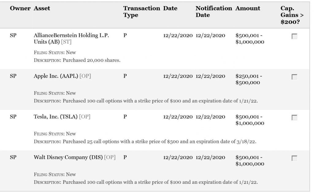 The power couple’s trades on Dec. 22 led to the purchase of 20,000 shares of New York-based investment management and research firm AllianceBernstein Holding L.P. (NYSE:AB), as well as buying call options in technology giant Apple (NASDAQ:AAPL), electric vehicle manufacturer Tesla Inc. (NASDAQ:TSLA) and entertainment and leisure giant Walt Disney Co. (NYSE:DIS). The call options are bullish trades that give the buyer the right to purchase shares in each stock for a specific amount, called the strike price, until the expiration date.