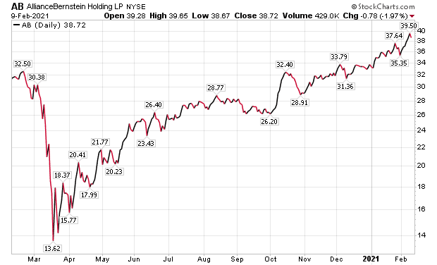 One seasoned Wall Street trader who has recommended investing in AllianceBernstein successfully three times since 2013 is Bryan Perry, who writes a monthly newsletter called Cash Machine that features dividend-paying equities. On each occasion, he included the AllianceBernstein purchases in Cash Machine‘s Accelerated Income portfolio.