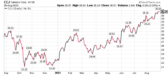 It is the second straight successful trade of a uranium stock that Skousen has made in TNT Trader in recent months. Subscribers to the TNT Trader service were able to scoop up a quick gain of 8.85% in Canada’s Cameco Corporation (NYSE: CCJ) between the recommendation on May 5 and the closing of the position on June 14. The stock paid a small dividend of $0.089 last Nov. 29, but it also offers opportunity for capital appreciation as a clean energy play.