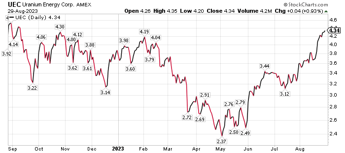 Skousen first brought Uranium Energy Corp. to my attention through his TNT Trader advisory service. He recommended the stock and related call options in TNT Trader on June 28. In just two months, the stock soared more than 25%. The related call options have jumped 133.33%.
