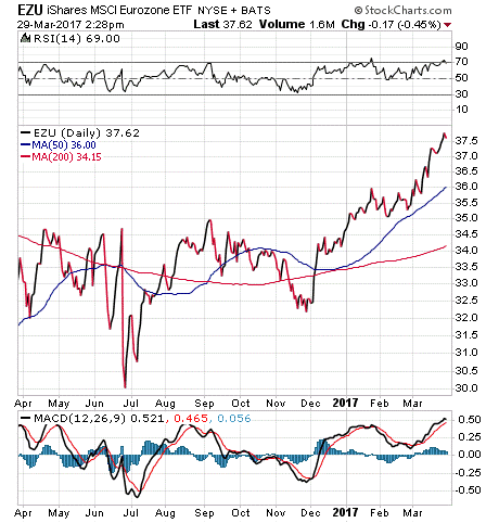 EZU has experienced ups and downs over the course of 2016, as evident in the chart below. However, it has performed well since December 2016 and its share price has climbed to new heights. As of March 2017, EZU had been trading at its highest levels since fall of 2015 and is up 9.31% year to date, versus a year-to-date 4.89% increase in the S&P 500. EZU has an expense ratio of 0.50% and a distribution yield of 2.84%.
