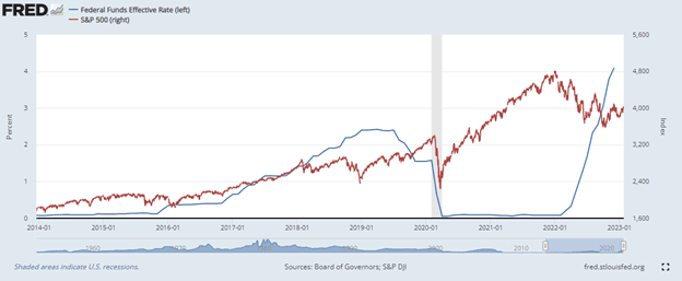 Unsurprisingly, lower rates boost asset performance. The line plot below of the Fed Funds Rate (blue) and the S&P 500 (red) illustrates this perfectly.