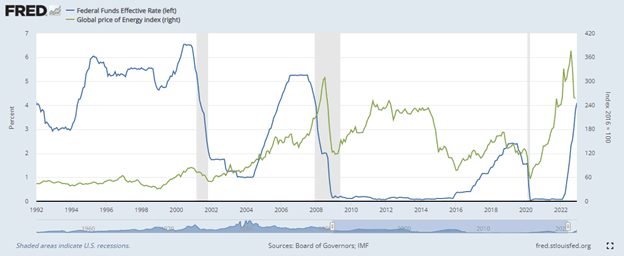 But watch what happens when we compare the global energy index to the Fed Funds Rate…