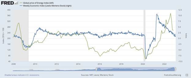 The graphic below plots the energy index but now brings in the weekly economic index.