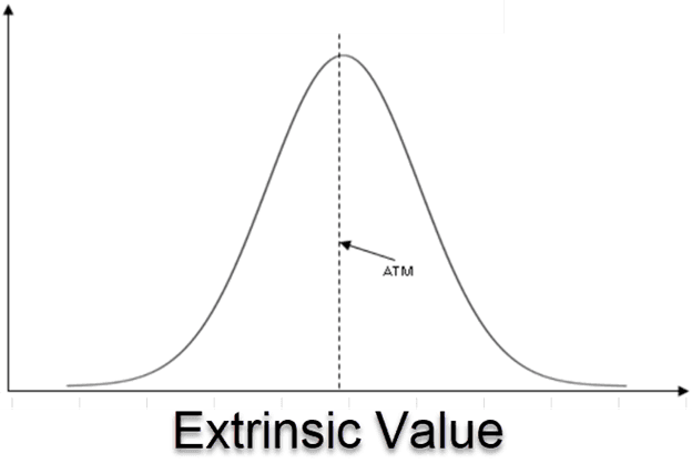 The extrinsic value of an option changes based on how far away the stock’s current price is from the strike price and forms a bell curve: