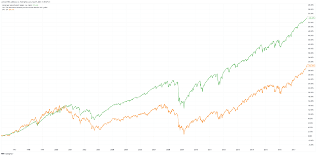 The green line shows the percent return for this strategy, while the orange line is the S&P 500.