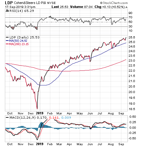 Cohen & Steers Limited Duration Preferred and Income Fund (NYSE:LDP) is Carlson’s recommendation to profit from reduced rates. The fund has a 30 percent leverage ratio, trades at a discount to net asset value of 1.97 percent, offers a distribution yield of 7.38 percent and has achieved a total return of more than 22 percent so far in 2019.