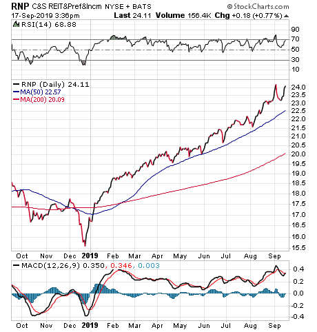 Investors can own roughly equal amounts of preferred securities and REITs through Cohen & Steers REIT & Preferred Income (NYSE:RNP), Carlson said. The fund has a yield of 6.31 percent and sells at a discount of 3.16 percent. So far this year, the total return of RNP is 38.72 percent.