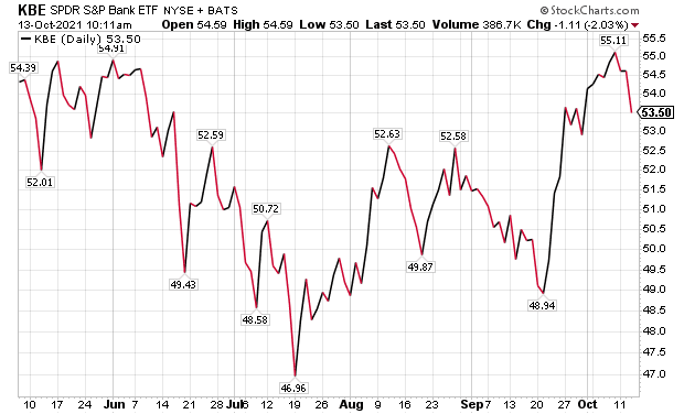 Last week’s column provided insight into a non-financial equal-weight exchange-traded fund (ETF), while this one can be considered a counterpoint. This week, we are interested in financials that compose the SPDR S&P Bank ETF (KBE).