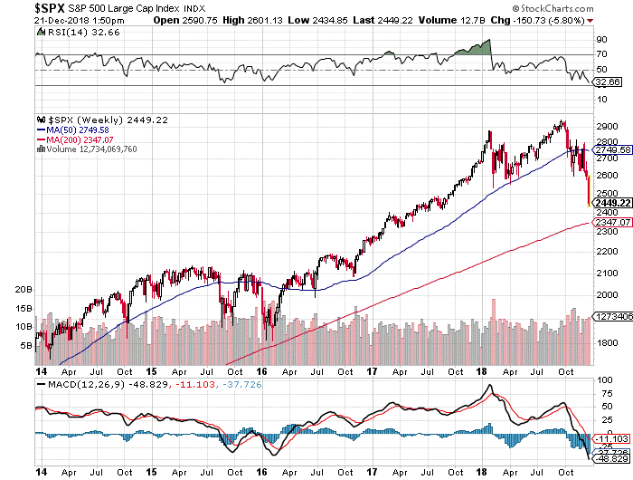 How low can the market go? Well, looking at the five-year chart of the S&P 500, which is the stock market’s key benchmark, the next major level of technical support is 2,350, per the chart below. This would represent another 5.2% downside in the current move which would take the S&P into bear market territory or find an institutional bid for the market. We won’t know until we get there. By most indicators, it looks like that level will be tested.
