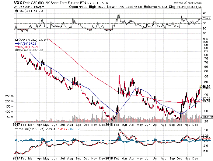 The market cap of VXX is $747 billion with average trading volume greater than 50 million shares per day. Currently trading at $45, VXX shares can trade significantly higher, per the two-year chart, below depending on the scale of the current correction and the speed with which the market challenges its next support level. This is a very effective way for investors to not just bet on further declines for the market, but also a highly useful way to hedge stock portfolios that are long in the market.