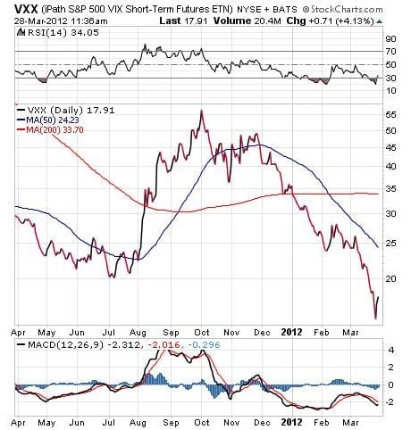 So far this year, the VIX has plunged more than 50%, indicating that fear has not been a factor on Wall Street in 2012. In fact, the VIX now is trading at its lowest point in nearly five years, and the fear gauge appears to be running on empty. The chart below of the iPath S&P 500 VIX (VXX) shows just how little fear is present in this market right now.