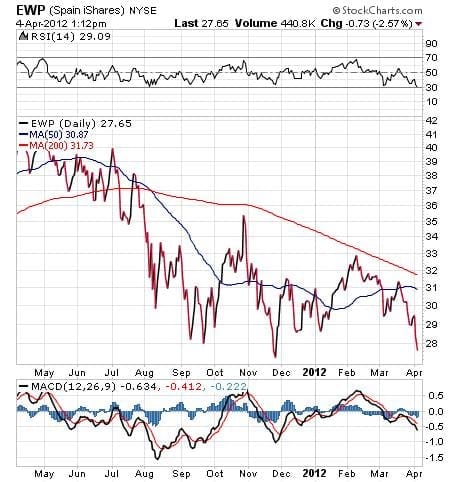 The chart here of the iShares MSCI Spain Index (EWP) shows the cratered sell-off in the country’s stock market. I think this situation could be the first big domino to fall in the European Union. If we see Spain go the way of Greece in terms of having to impose hefty austerity measures, it could put some serious pressure on global markets going forward.