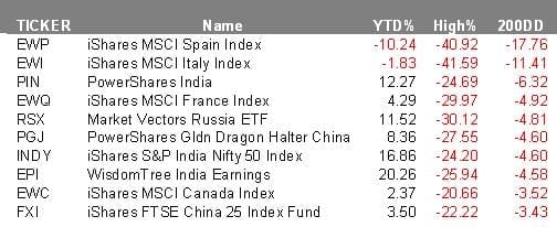If we take a look at the data for country-specific ETF’s, we see that they now are well off their highs, and well below their respective 200-day moving averages. The table below shows the struggle that continues in many of the biggest country-specific funds.