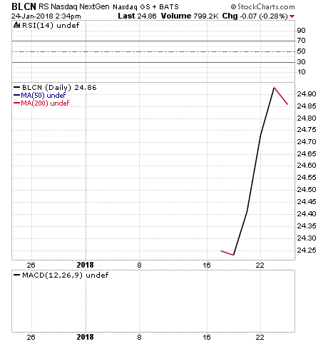 Many recently launched funds were created to take advantage of this blockchain technology, which some observers view as revolutionary. BLCN, created on January 17, 2018, through a partnership between Reality Shares and Nasdaq, is one of those funds. The fund seeks long-term growth by investing in blockchain-related companies.