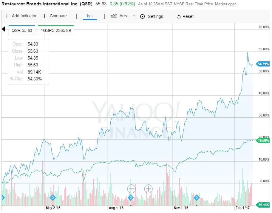 While 3G is slashing and burning, Pershing Square’s investors are reaping the rewards as well. As the chart below confirms, Ackman’s big bet on Restaurant Brands International has served him well.