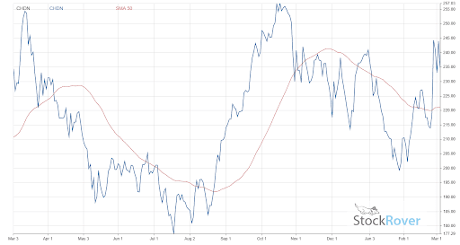 The company maintains a Stock Rover growth score of 98/100 and is forecast to record a 51.1% increase in sales in 2021 once its 2021 10-K’s are released. As a result, Churchill Downs has managed to weather the recent downturn in the casino industry better than most. CHDN has seen its share price encounter a modest drop of 1.7% over the trailing 12 months. CHDN’s change in price is displayed alongside a 50-day moving average.