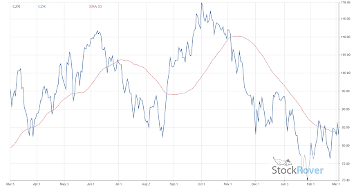 Caesars, however, has been hurt by COVID-19 and the subsequent Delta and Omicron variants. The company has suffered nearly $2.9 billion in losses over the past two years. The losses have caused CZR’s price to remain relatively flat, with the stock only growing by 0.9% over the past year. CZR’s share price and 50-day moving average over the past 12 months are charted below.