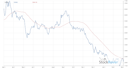 DraftKings has encountered a significant slide over the past year due to missed earnings and fears about Omicron’s impact on professional sports. The company’s stock has fallen by 69.7% over the past year. DKNG’s movement over the trailing 12 months is graphed below, along with a 50-day moving average to better illustrate change.