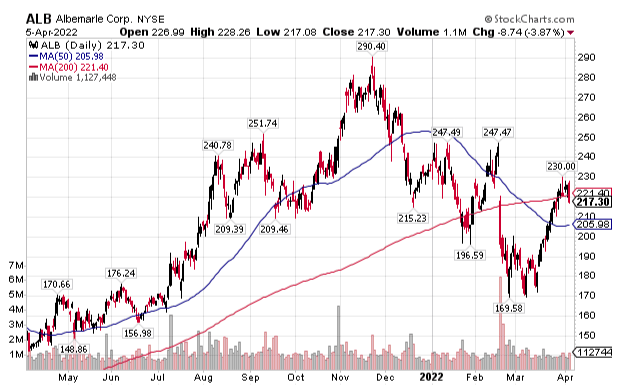 “ALB is definitely one to feature,” said Jim Woods, who heads the Successful Investing and Intelligence Report investment newsletters, as well as the Bullseye Stock Trader and High Velocity Options trading services.