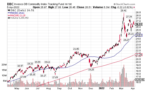 The Invesco DB Commodity Index Tracking Fund (NYSE ARCA: DBC) is another way to invest broadly in commodities, Carlson commented. DBC edged up 1.65% in the last week, dipped 1.85% in the past month, but climbed 26.12% since the start of 2022 and 27.57% in the past 12 months.