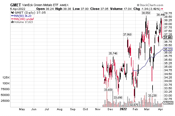 GMET seeks to track the price and yield performance of the MVIS Global Clean-Tech Metals Index (MVGMETTR). The fund aims to mirror the performance of companies involved in the production, refining, processing and recycling of green metals that are used in the applications, products and processes that enable the energy transition from fossil fuels to cleaner energy sources and technologies.