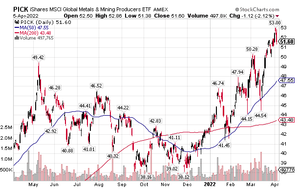 PICK has climbed 1.53% in the past week, 3.61% for the last month, 21.07% so far in 2022 and 25.58% in the past 12 months. The ETF tracks an index of global mining companies that excludes gold and silver miners.