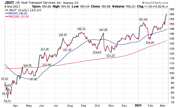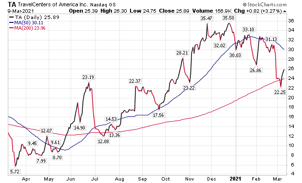 “The rigs must roll,” said Hilary Kramer, who hosts the nationally aired “Millionaire Maker” radio program and heads the GameChangers and Value Authority advisory services. “My favorite trucking theme is actually the companies that run the rest stops that capture so much driver spending along the road. Unfortunately, most of the big chains are privately held and one of the best — Service Properties Trust (NYSE:SVC) — has diluted its core service center holdings with too many hotels and retail properties to qualify as a pure play now. That’s a real shame, especially since hospitality occupancy rates went off a cliff last year, taking what was once a solid dividend with them for the foreseeable future.”