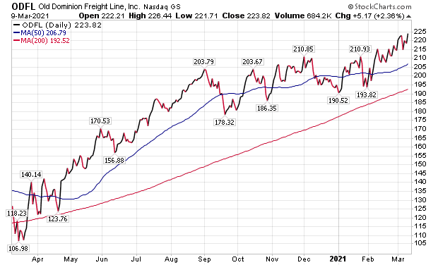 “In terms of pure freight carriers, we were lucky enough to get Old Dominion Freight Line Inc. (NASDAQ:ODFL) on our screen under $70 several years ago,” Kramer said. “Looking at it now, it’s a great argument for the longevity of road transport… and there’s still long-term upside left to capture.”