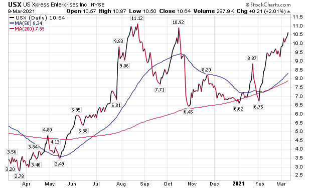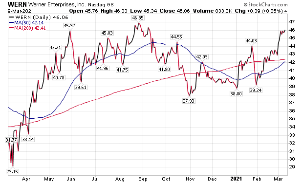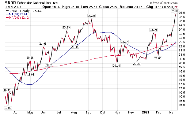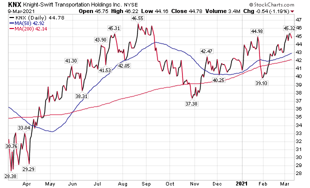 “An exception might be Knight-Swift Transportation Holdings Inc. (NYSE:KNX),” said Carlson, who also leads the Retirement Watch investment newsletter. “While the stock is up about 42% in the last 12 months, it lags behind most others in the sector and trades at a lower valuation. This is despite positive comments from the company about expectations for coming quarters.”