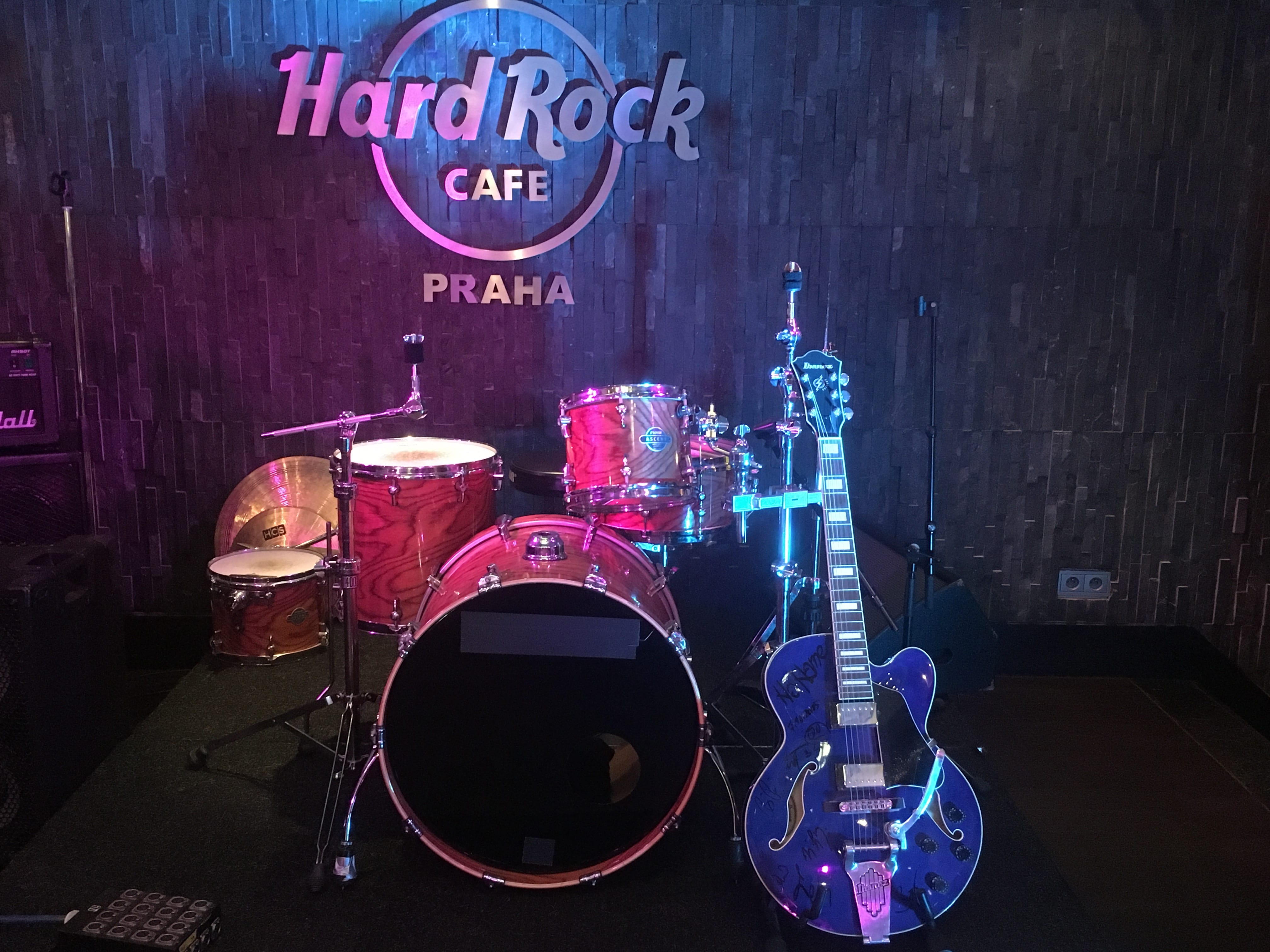 This guitar at the Hard Rock Cafe in Prague was donated by the “No Name” rock band for a charity event. Each band member signed the guitar.