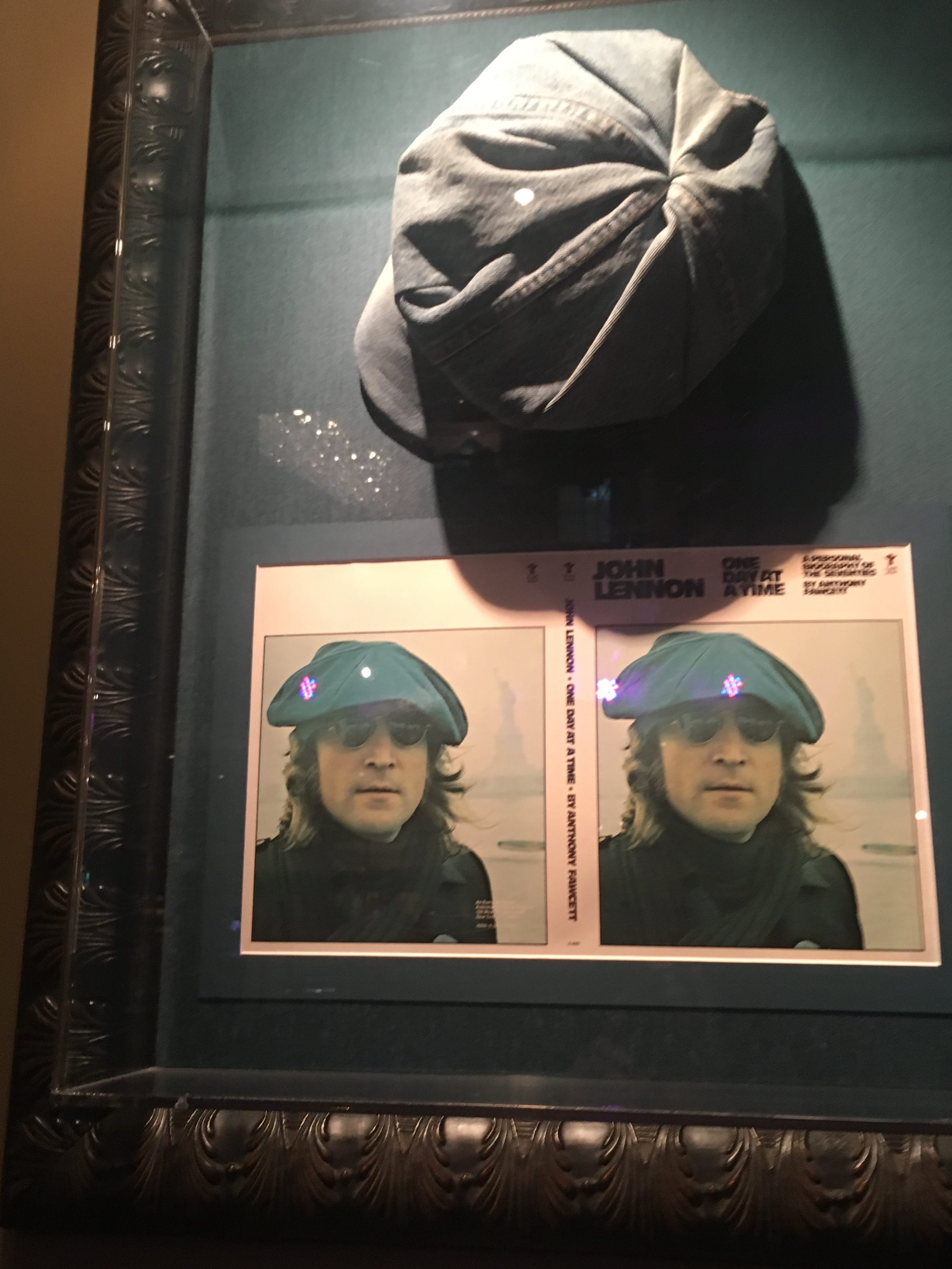 This memorabilia features a photo of John Lennon and his cap at the Hard Rock Cafe in Prague.
