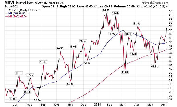 Hamilton, Bermuda-based Marvell Technology, Inc. (NASDAQ:MRVL), a developer and producer of semiconductors and related technology, ranks as one of the six 5G stocks to buy, according to BoA. The stock is poised to growth strongly as market opportunities increase in the second half of 2021 and beyond.
