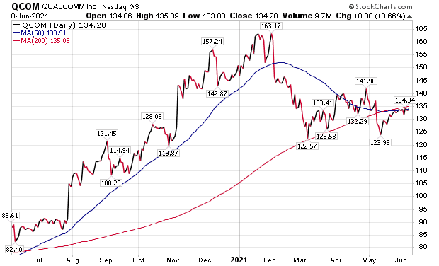San Diego-based Qualcomm Inc., (NASDAQ:QCOM) creates semiconductors, software and services related to wireless technology. The company owns patents that are important to the 5G, 4G, CDMA2000, TD-SCDMA and WCDMA mobile communications standards.