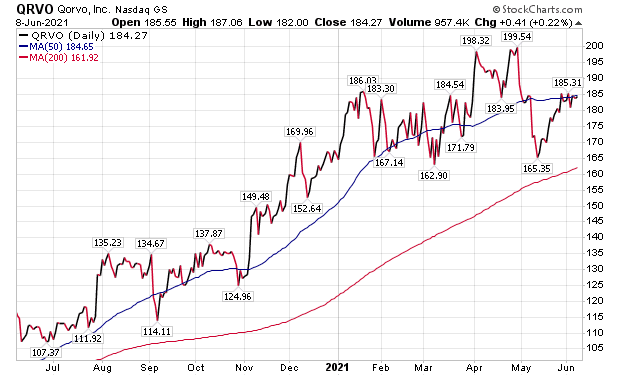 Qorvo (NASDAQ:QRVO), a Greensboro, North Carolina-based semiconductor company that designs, manufactures and supplies radio-frequency systems for applications that drive wireless and broadband communications, as well as foundry services, is another 5G play that received a buy rating from BoA. The investment firm gave a $215 price objective to Qorvo based a valuation that is at the higher end of the semiconductor company’s long-term range but justified by BoA due to upcoming major product ramp-ups and lessened customer concentration relative to its peers.