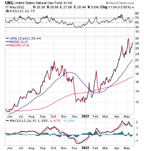 “Natural gas should continue to be a good investment, as long as Europe is looking for ways to reduce dependence on Russia,” Carlson told me. “In addition, the natural gas drillers in the U.S. are focused on increasing cash flow and earnings. They’re not inclined to maximize drilling expenses in the short run to increase output.”