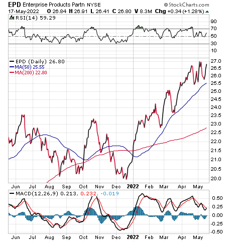 I personally have owned Enterprise Products Partners since shortly after the 2020 stock market crash when I bought the stock as it began to rebound. At the market’s close on May 16, the stock had gained 1.46% for the past week, 0.69% for the last month, 12.23% for the past three months, 24.73% so far in 2022 and 18.42% for the last year.