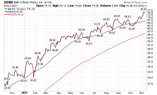 BBWI received a “Buy” recommendation and a $90 price objective from BofA. The investment firm called Bath & Body Works one of the best positioned retailers going into the holiday season and into 2022.