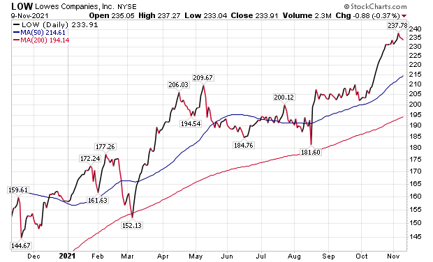 Veteran stock picker Jim Woods, who leads the Intelligence Report and Successful Investing newsletters, as well as the Bullseye Stock Trader advisory service, includes Lowe’s among his recommendations. Specifically, Woods recommends LOW in his Intelligence Report Income Multipliers portfolio. That stock has been a profitable pick for his subscribers since he added it.