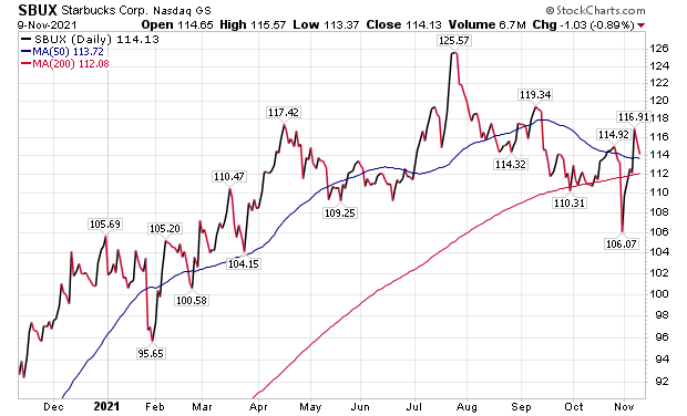 “We believe SBUX is positioned to benefit from increased interest in gift cards as it leverages digital and out-of-store channels and creates a promotional presence in the drive-through lanes that, along with Mobile Order & Pay, account for 70% of transactions,” BofA wrote. “While Starbucks faces supply-chain pressures, it has added new manufacturing and supply partners and is seeing inventory constraints ease in key categories.”