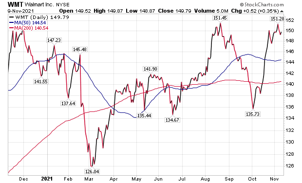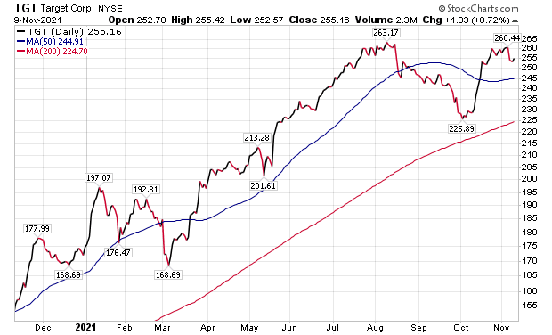 BofA’s two top picks in the discount retail sector are Walmart and Target (NYSE: TGT) due to their strong inventory positions, favorable port access, long-term container shipping agreements and chartered vessel capacity, according to BofA. Both WMT and TGT, while not immune to the current challenging supply chain and rising cost environment, are particularly well positioned relative to the broader competitive retail landscape heading into the holiday, the investment firm concluded.