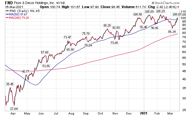 The company’s CFO Trevor Lang appeared at the conference on March 10 to share his vision. One observation in markets such as Florida and Texas, which are reopening and among the company’s largest, is that demand has not weakened. Since FND closed its stores for several weeks during 2020 in many markets, its year-over-year comparisons will be easier than for the home centers such as Lowe’s and Home Depot in the quarters ahead this year.