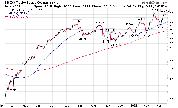 “I do much of my shopping for feed and supplies at Tractor Supply,” Woods told me. “It’s one of the best-run retail operations around, and the best part for investors and traders is the shares are close to breaking out to new highs — always a bullish sign.”